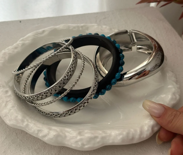 The Mosaic Metal Stack Bracelet presents a contemporary approach to layered jewelry through interlocking metal segments that create dynamic visual patterns. Each band features distinct textural elements that harmonize when worn together, while remaining striking when worn separately. The modular design philosophy allows wearers to compose their own aesthetic, mixing and matching segments to suit different occasions and moods.Β